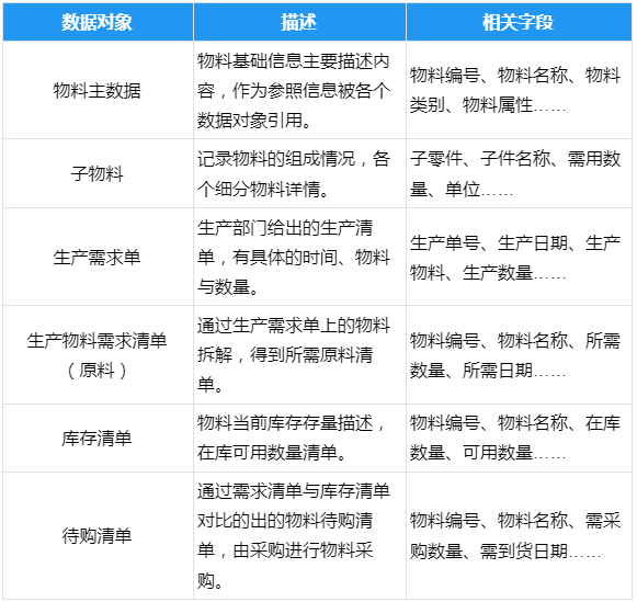 (仅罗列了在此次简易 MRP 中必要对象)将上述对象转化为工作表,并利用关联关系将他们建立起逻辑结构。