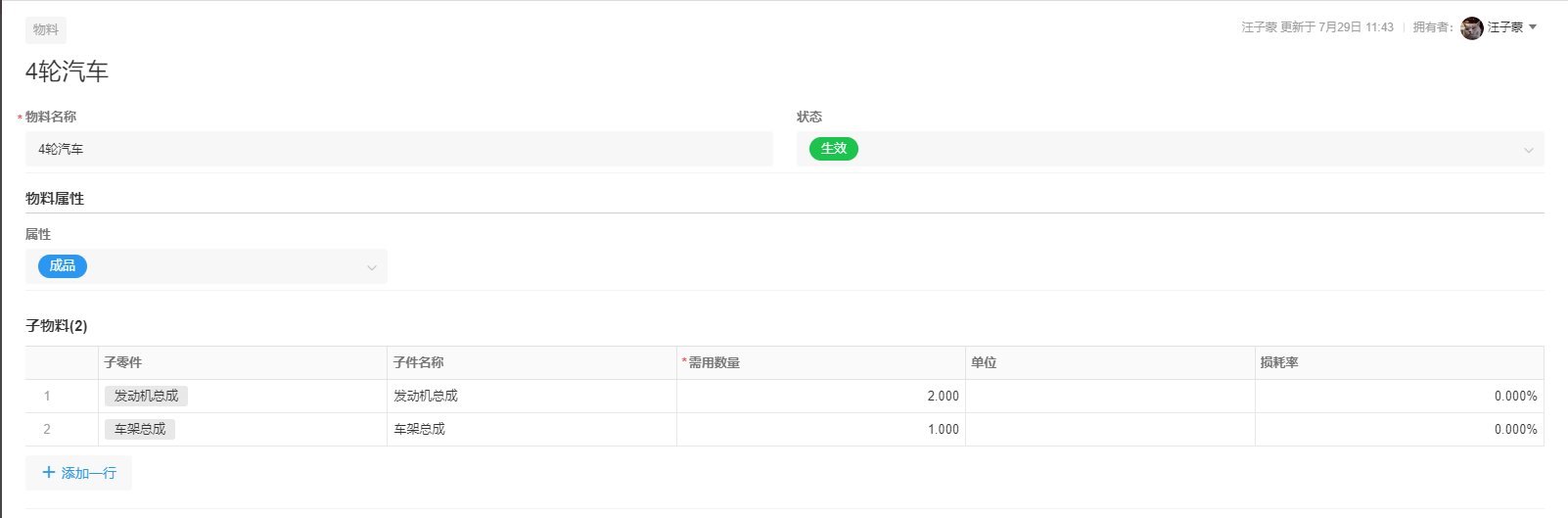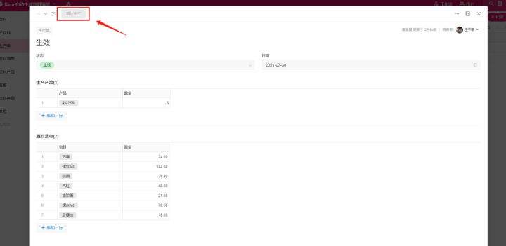 生产员在生产单内录入需要生产的产品,点击表单上方的“确认生产”按钮,自动生效生产单,并生成生产该产品所需的原料清单。
